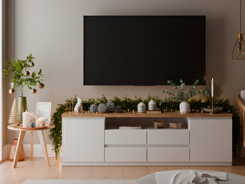 Elegí pocos elementos: una guirnalda verde, dos velas y un adorno protagonista. Los racks de Belgrano Home, con líneas simples y tonos neutros, permiten decorar sin saturar el espacio. La clave: equilibrio y superficies despejadas.