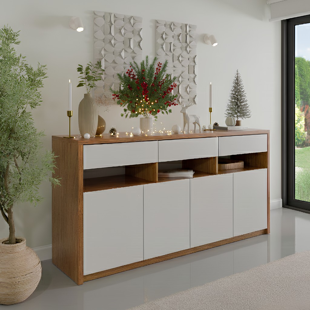 Los Vajilleros son ideales para crear un rincón elegante. Suma un arreglo minimalista con follaje, velas y un objeto dorado o blanco. Menos piezas, más impacto visual.