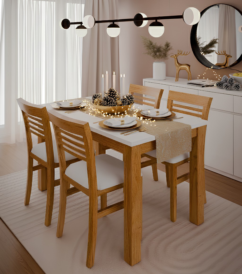 Un centro de mesa simple con ramas verdes, velas y elementos naturales hace que la mesa luzca festiva sin perder su estilo. Las sillas y mesas de Belgrano Home, de diseño limpio, permiten que la deco luzca sin competir con el mobiliario.