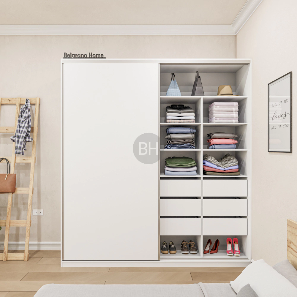 El placard Charlie es amplio y cómodo, diseñado con puertas corredizas que incluyen perfiles y rieles de aluminio para un deslizamiento suave y duradero. Su interior completo ofrece una baulera, un doble barral para colgar ropa, seis cajones con guías metálicas, espacio para zapatos, y estantes perfectos para organizar la ropa doblada. Este placard es la solución ideal para mantener todo en su lugar con estilo y funcionalidad